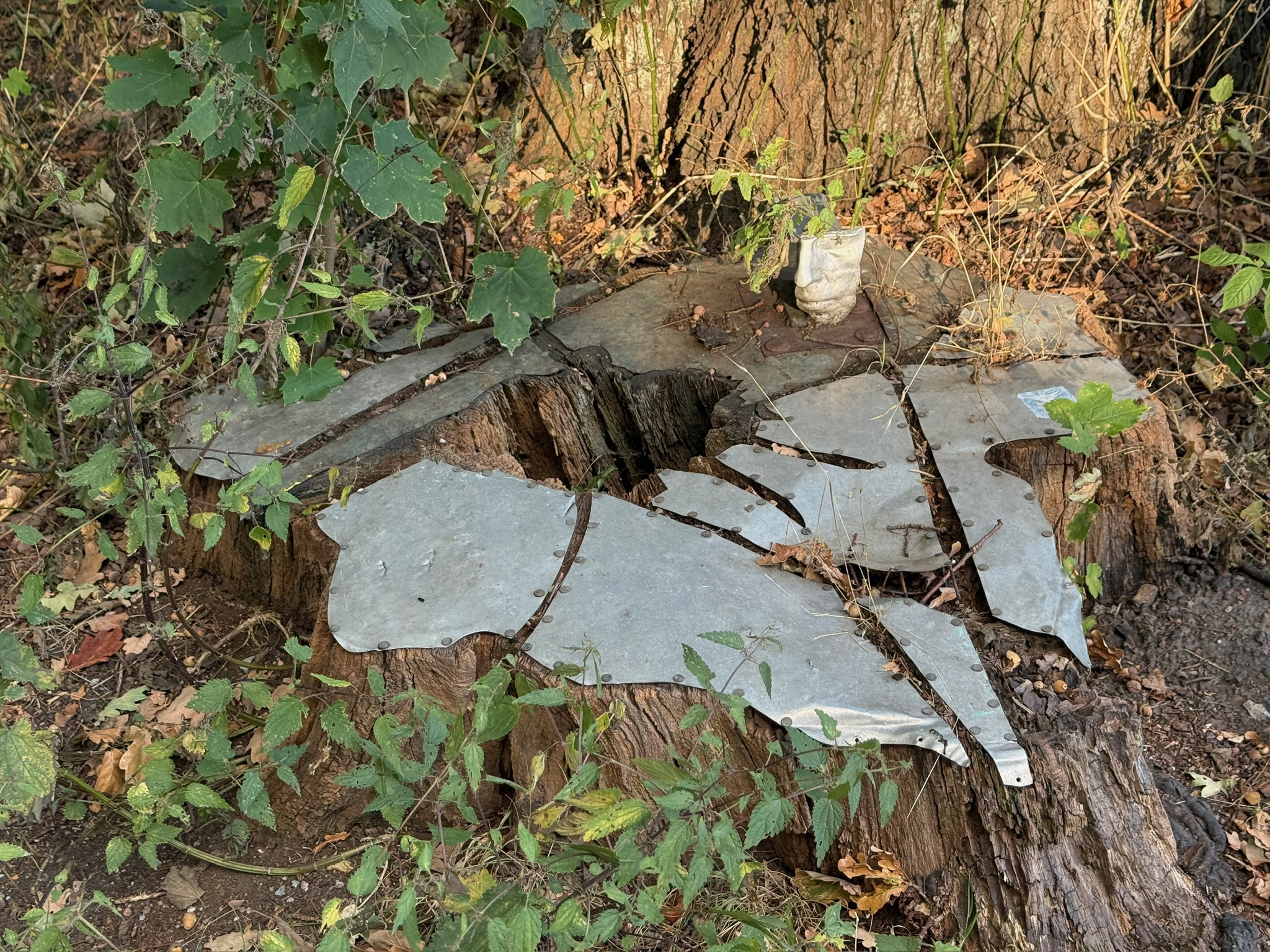 Im Gehölz stößt man leider bisher nur auf ein einziges kleines Kunstwerk. Im Gehölz 1a, also dem Teil östlich der Wandsbeker Bahnhofstraße, am nördlichen Ende der kleinen Parkanlage, findet sich ein kleines Werk, das man beim Vorbeigehen fast gänzlich übersieht: Der Baumstumpf wurde mit einzelnen Metallplatten zugenagelt und der Künstler hat eine halbe Maske eines Gesichtes aus Metall hinterlassen. Leider finden sich keine Hinweise zum Künstler selbst.