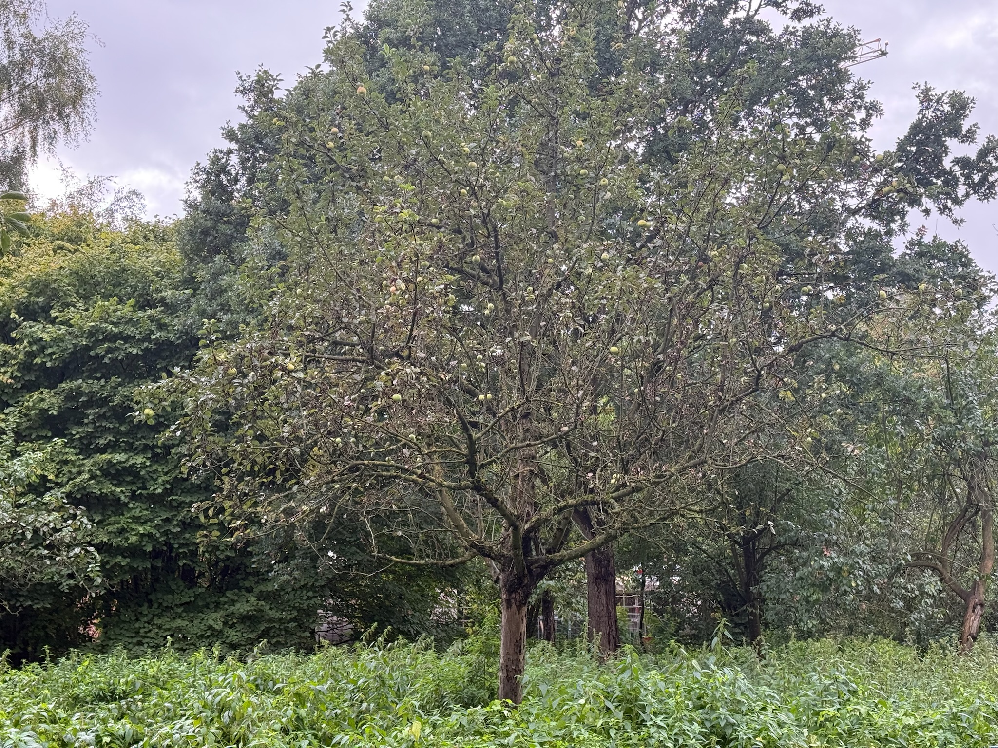 Der Apfelbaum steht – übrigens neben Kirsch- und Pflaumenbäumen – auf der Streuobstwiese am östlichen Ende des fünften Gehölzes, nahe des Holstenhofwegs. Das ist öffentliches Gelände, somit kann jeder von dem Obst pflücken.