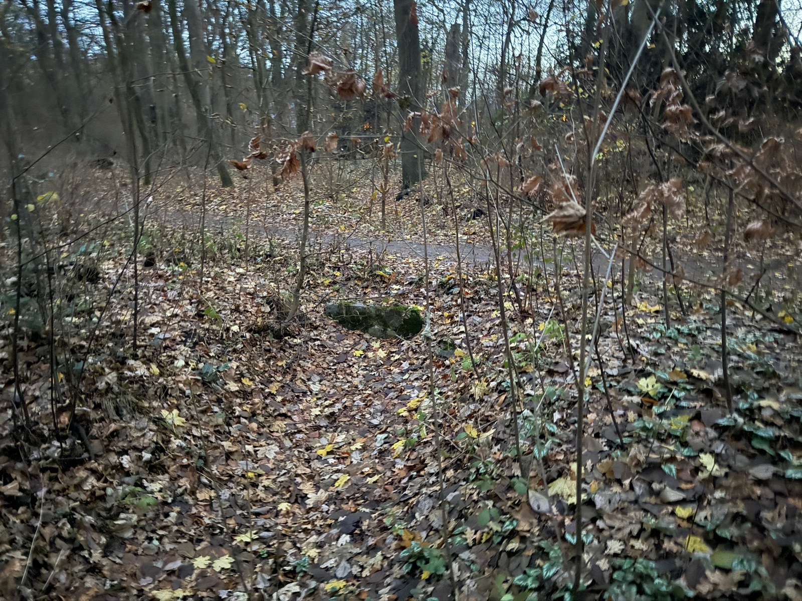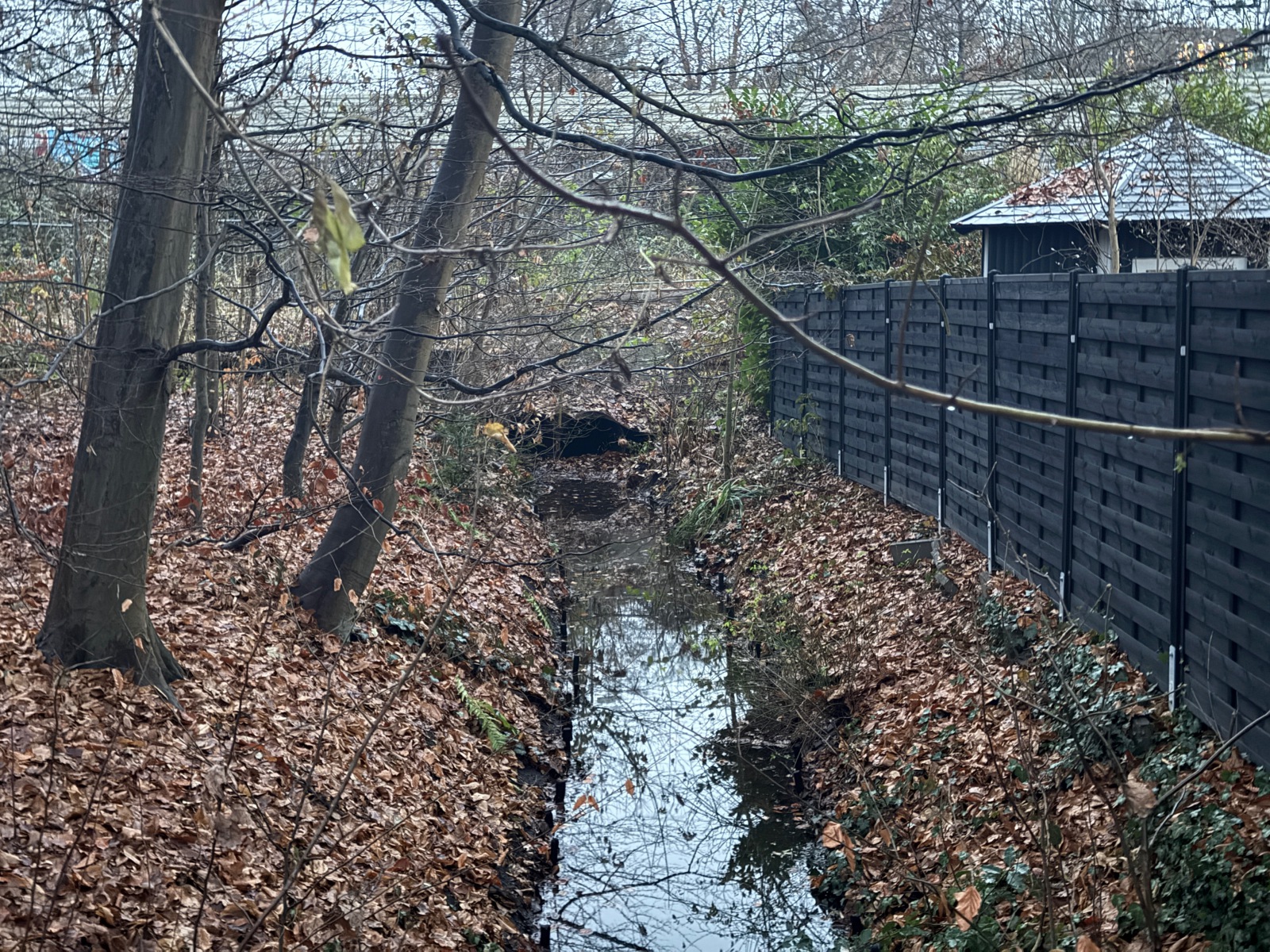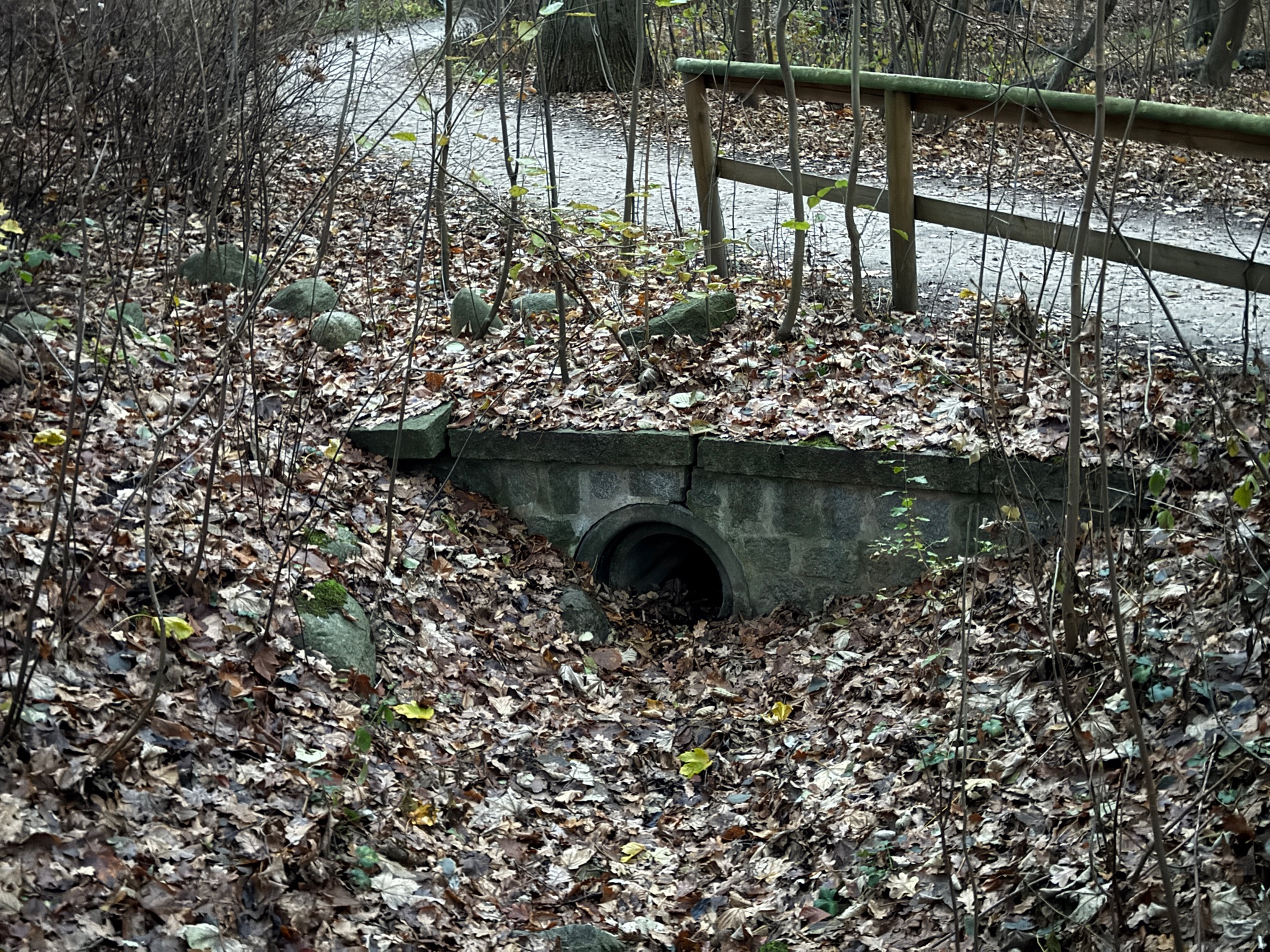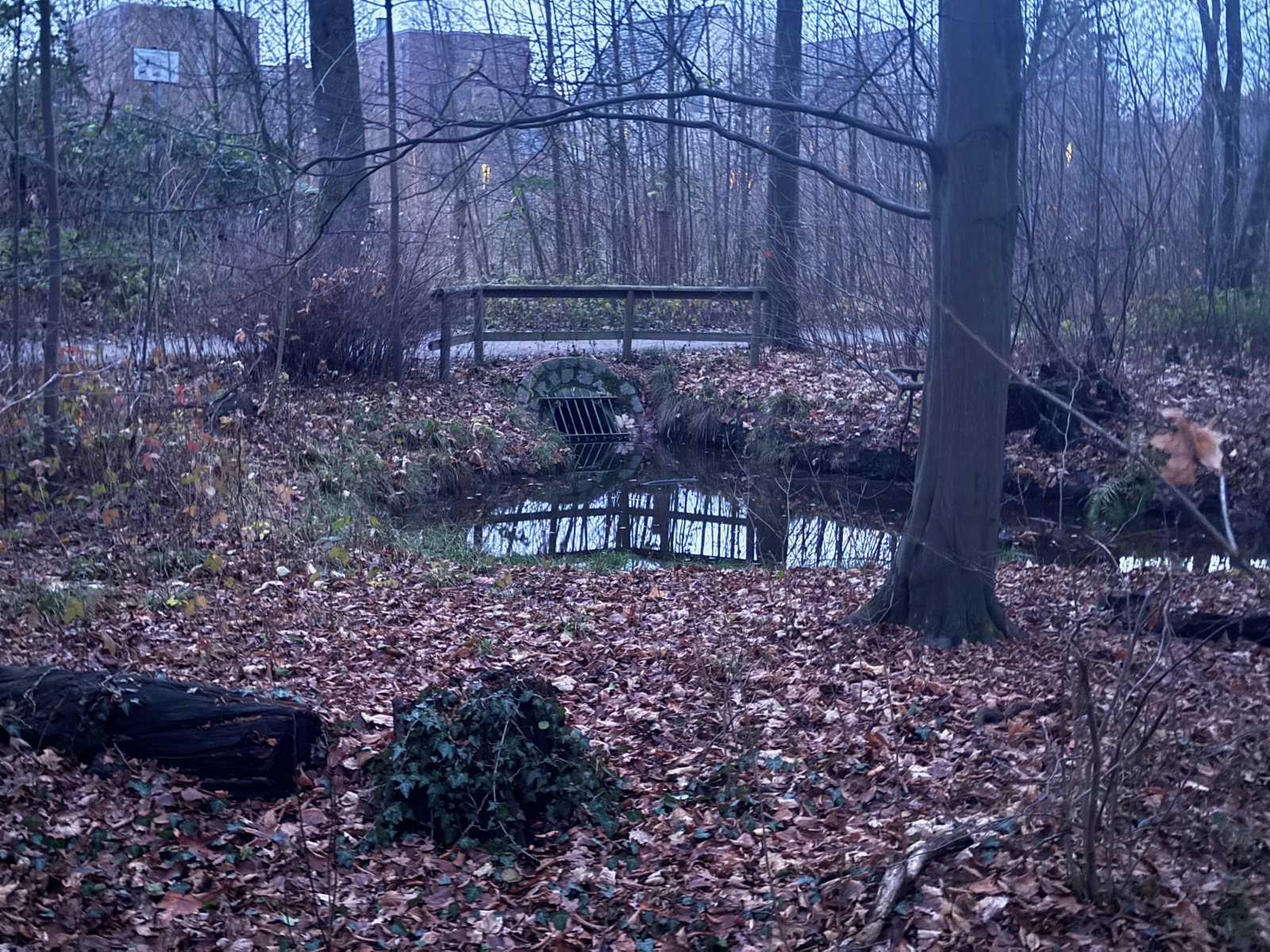Gehölz 2 hat mehrere, und zwar gewohnte, Brücken, die sich schon optisch von den Spazierwegen abheben, da sie auch jeweils ein Geländer haben. Hier führt der Gehölzgraben auch in Süd-Nord-Richtung eigentlich immer Wasser, denn dieses wird über ein Pumpenhäuschen weiter südlich in Marienthal unter der Autobahn hindurch von Horn aus heraufgepumpt.