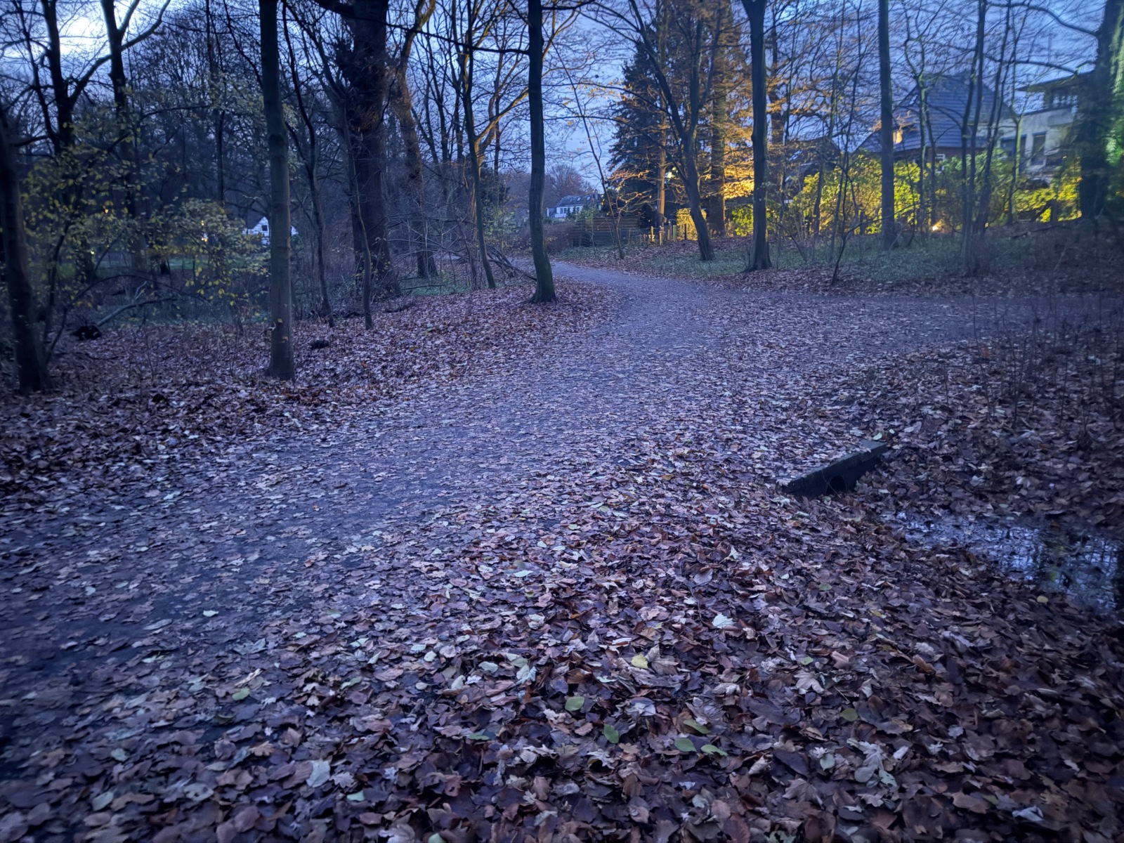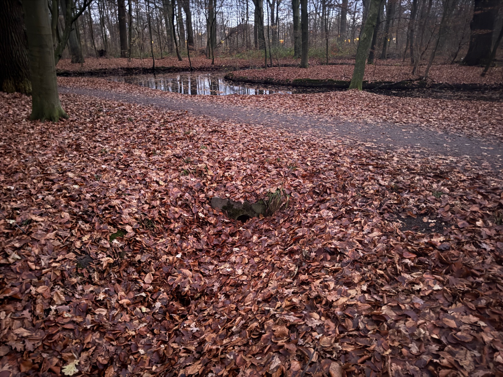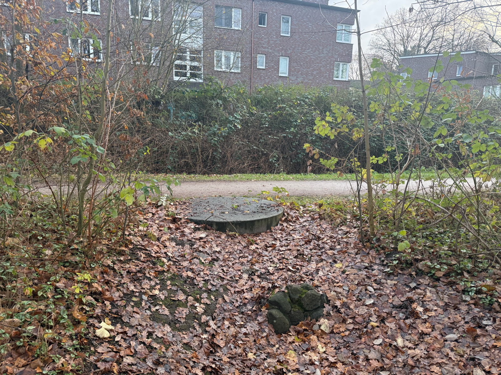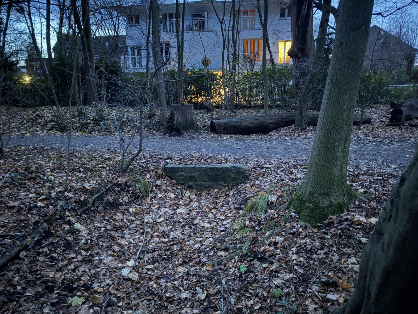 Gehölz 2 hat mehrere, und zwar gewohnte, Brücken, die sich schon optisch von den Spazierwegen abheben, da sie auch jeweils ein Geländer haben. Hier führt der Gehölzgraben auch in Süd-Nord-Richtung eigentlich immer Wasser, denn dieses wird über ein Pumpenhäuschen weiter südlich in Marienthal unter der Autobahn hindurch von Horn aus heraufgepumpt.