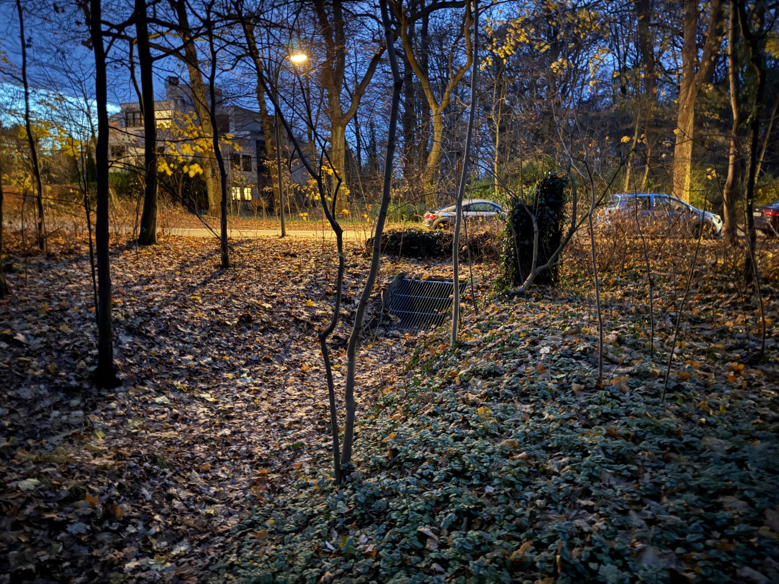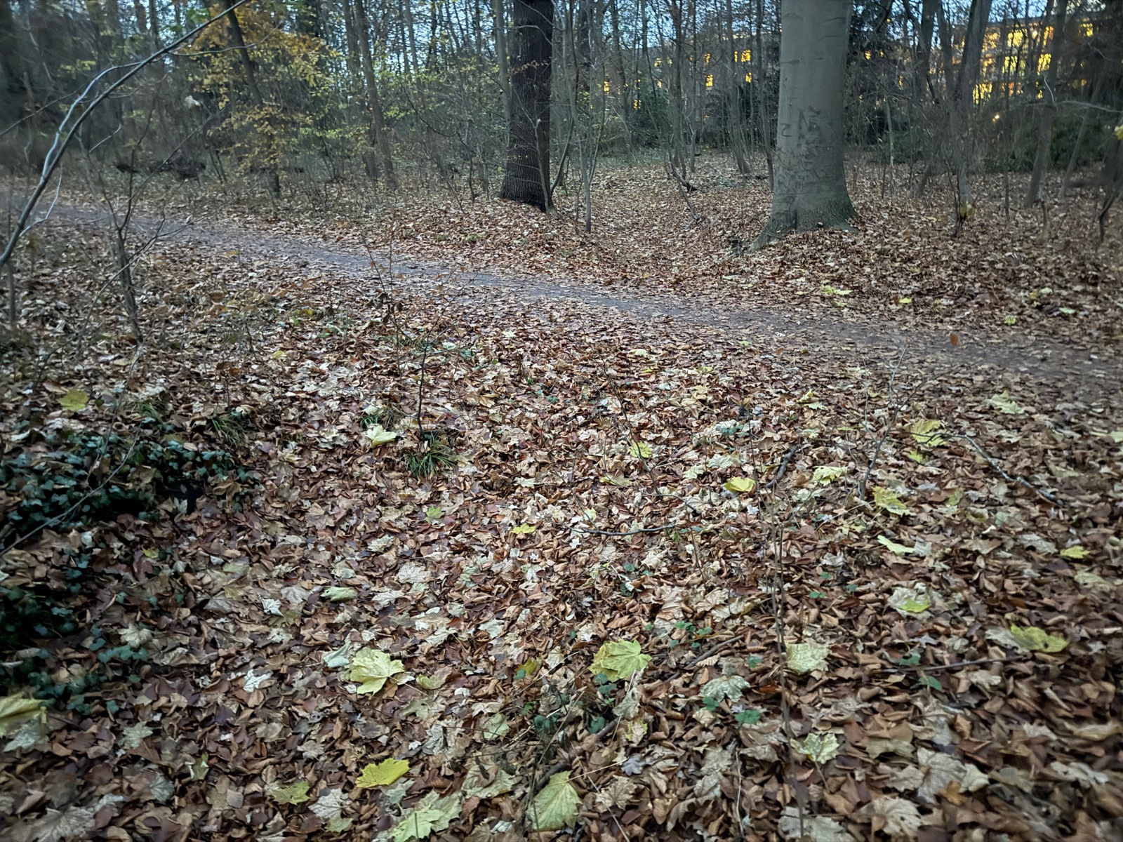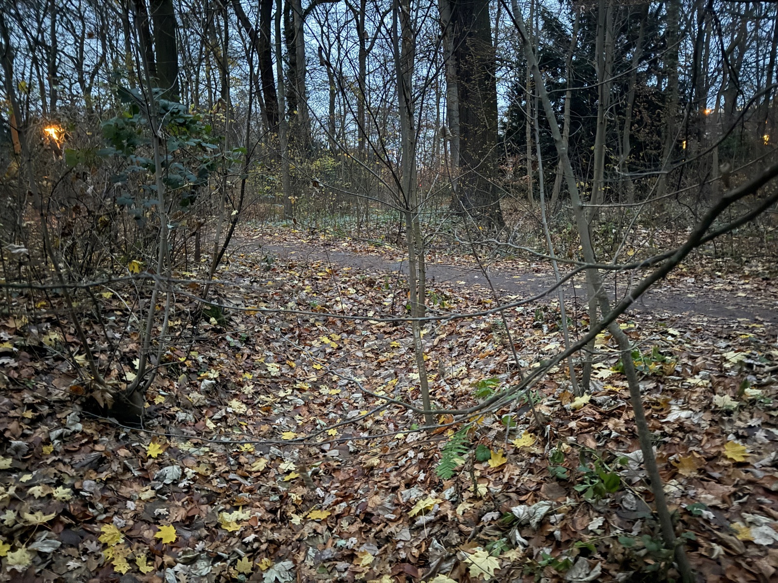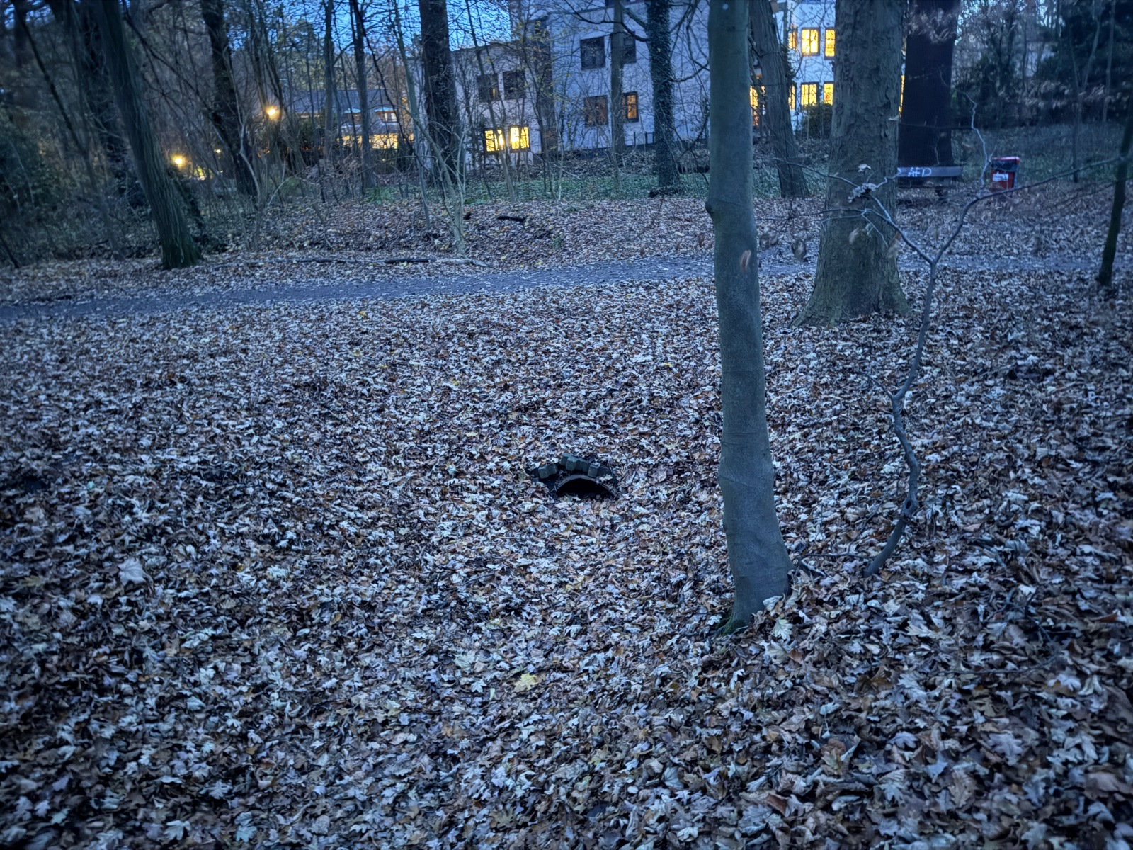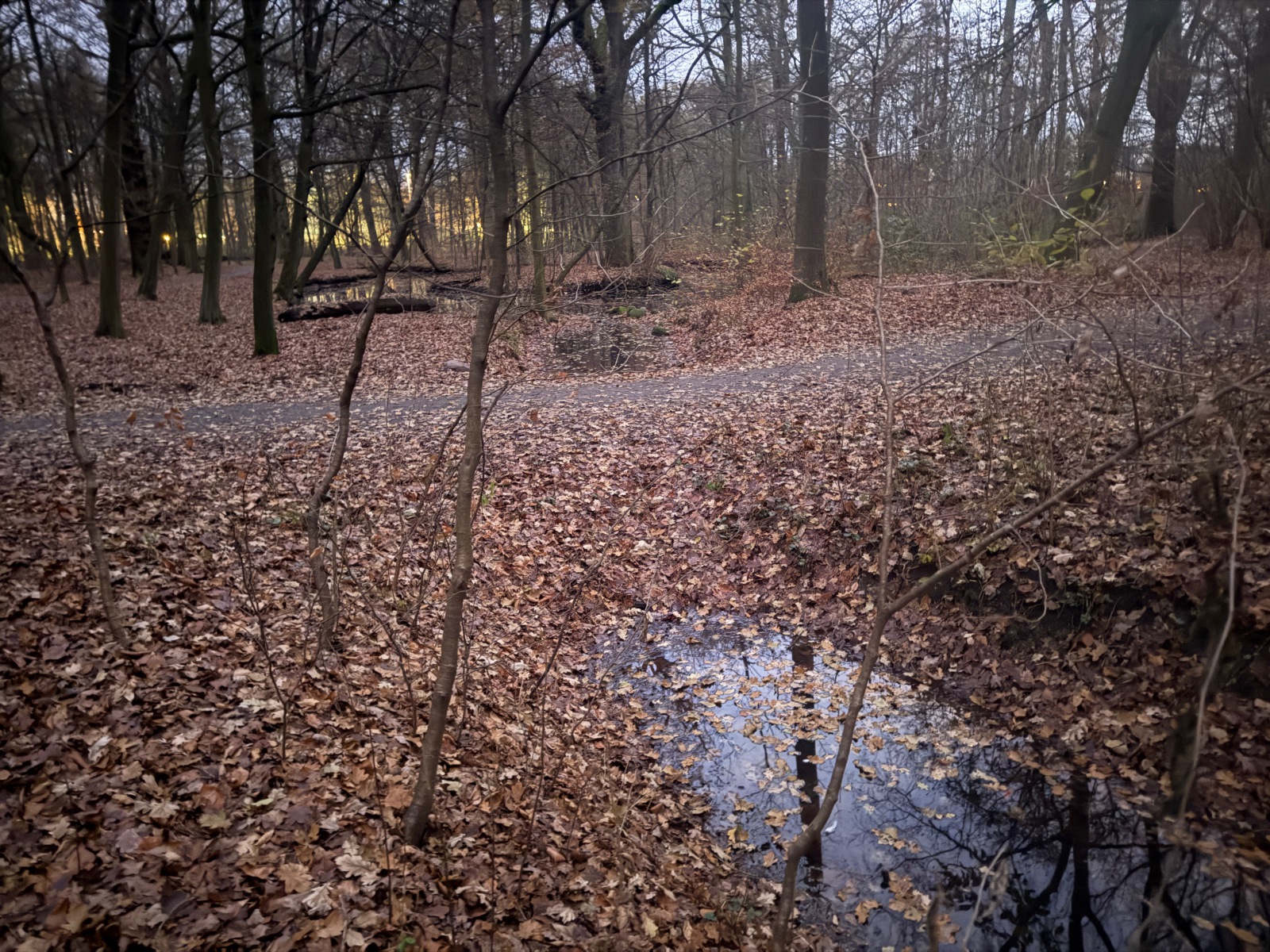 Gehölz 2 hat mehrere, und zwar gewohnte, Brücken, die sich schon optisch von den Spazierwegen abheben, da sie auch jeweils ein Geländer haben. Hier führt der Gehölzgraben auch in Süd-Nord-Richtung eigentlich immer Wasser, denn dieses wird über ein Pumpenhäuschen weiter südlich in Marienthal unter der Autobahn hindurch von Horn aus heraufgepumpt.