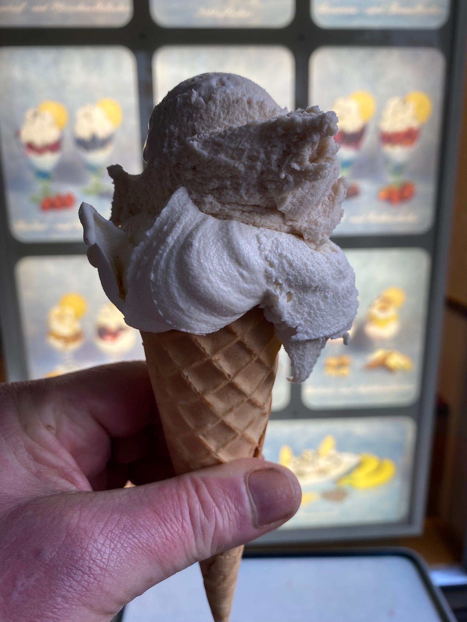 Jetzt kann man wieder ein ganzes halbes Jahr lang leckeres, selbst hergestelltes Eis genießen. Empfehlenswert wie in jedem Jahr ist besonders das Belgische Eis, das mit einer sehr großen Menge Kakao hergestellt wird, aufgrund dessen im Preis um 10 Cent pro Kugel teuerer ist und das aber exzellent schmeckt.